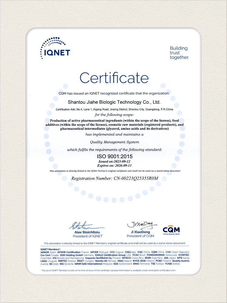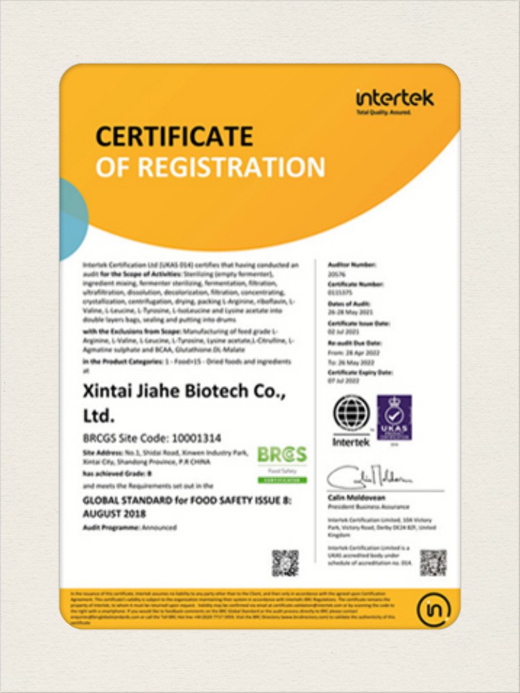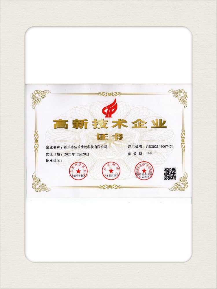 汕頭佳禾生物科技有限公司是一家致力于氨基酸及其衍生物研發(fā)、生產(chǎn)和銷售的國家高新技術(shù)企業(yè),先后通過了國家藥品GMP認(rèn)證,ISO9001質(zhì)量體系認(rèn)證、ISO14001環(huán)境管理體系認(rèn)證。目前,公司擁有“廣東省專精特新中小企業(yè)”、“廣東省氨基酸產(chǎn)品工程技術(shù)研究中心”、“汕頭市生物發(fā)酵工程技術(shù)研究開發(fā)中心”、“汕頭市知識(shí)產(chǎn)權(quán)優(yōu)勢(shì)企業(yè)”、“多項(xiàng)國家發(fā)明專利”、“廣東省守合同重信用企業(yè)”等多項(xiàng)資質(zhì)和榮譽(yù),旗下“佳禾牌”系列產(chǎn)品已成為原料藥行業(yè)知名品牌。 新泰市佳禾生物科技有限公司成立于2012年8月,注冊(cè)資金2億元,公司位于山東泰安新泰市新汶工業(yè)園區(qū),是國 家級(jí)高新技術(shù)企業(yè)、山東省“專精特新”企業(yè)、山東省制造業(yè)單項(xiàng)冠軍企業(yè)、泰安市科技型中小企業(yè)、泰安市農(nóng)業(yè)產(chǎn)業(yè)化龍頭企業(yè)、中國生物發(fā)酵產(chǎn)業(yè)協(xié)會(huì)理事單位。